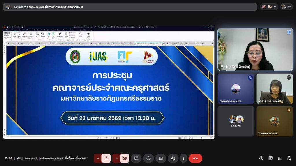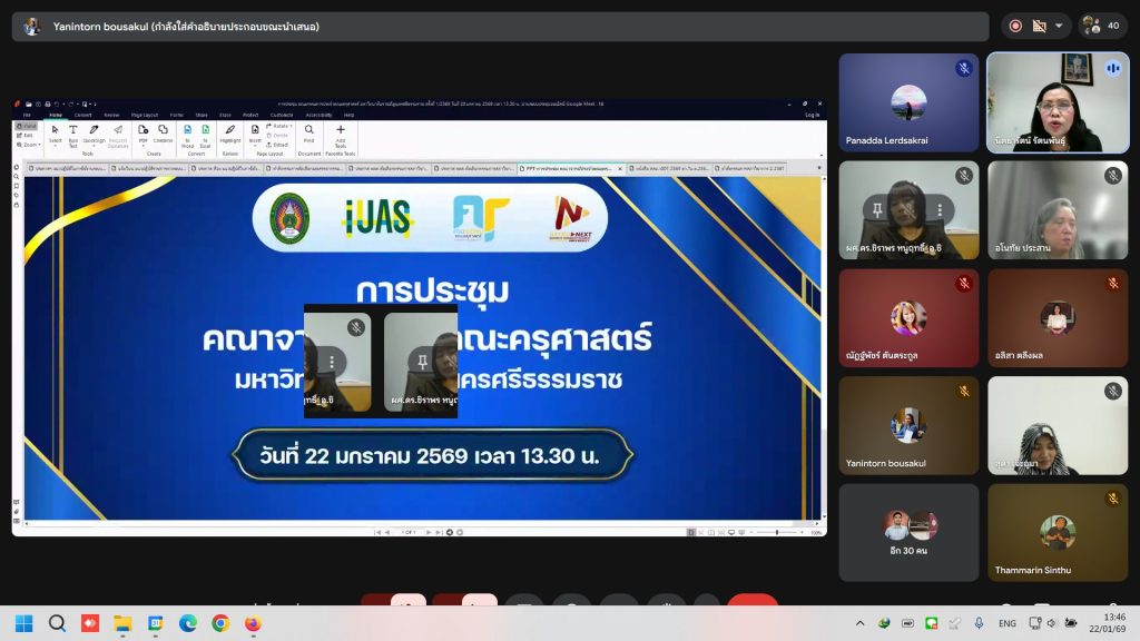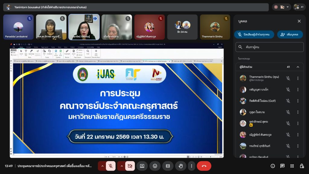 เมื่อวันที่ 22 มกราคม 2569 คณะครุศาสตร์ มหาวิทยาลัยราชภัฏนครศรีธรรมราช จัดการประชุมคณาจารย์ประจำคณะครุศาสตร์ ผ่านระบบออนไลน์ Google Meet โดยมี ผู้ช่วยศาสตราจารย์นิตยารัตน์ คงนาลึก เป็นประธานการประชุม เพื่อชี้แจงประกาศและหลักเกณฑ์การคัดเลือกและสรรหากรรมการสภาวิชาการ แทนชุดเดิมที่จะครบวาระในวันที่ 27 กุมภาพันธ์ 2569 นี้ โดยมีสาระสำคัญจากการประชุม ดังนี้
