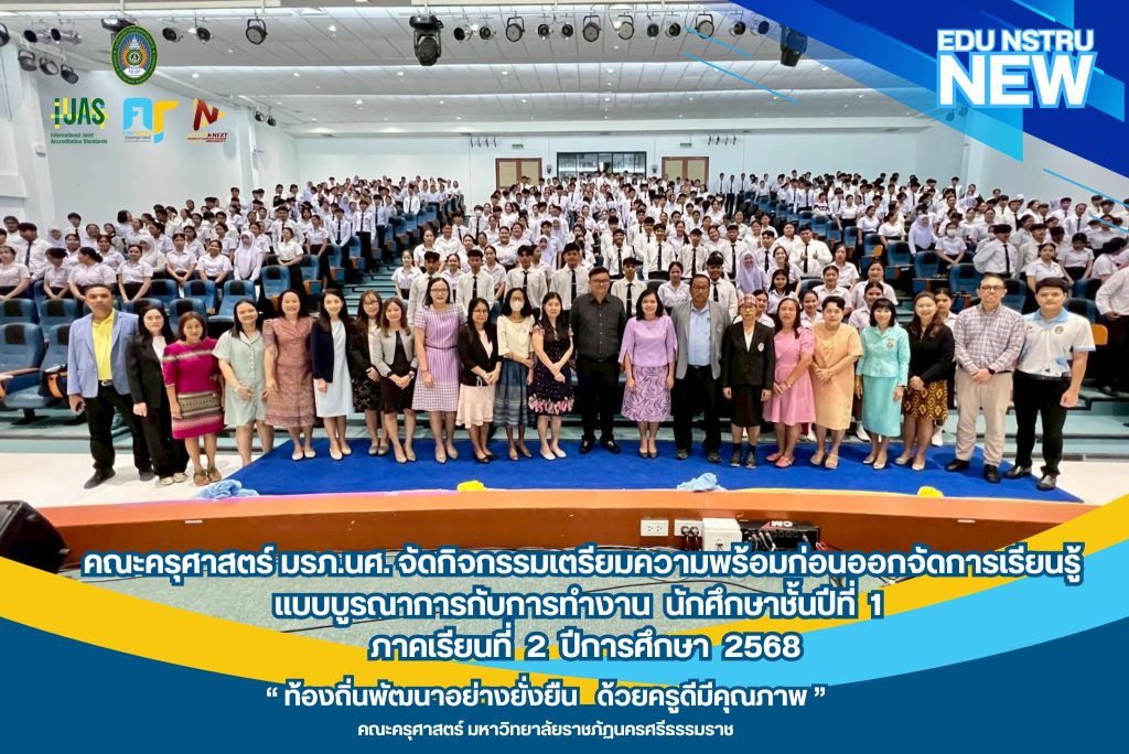 คณะครุศาสตร์ มหาวิทยาลัยราชภัฏนครศรีธรรมราชจัดปฐมนิเทศเตรียมความพร้อมก่อนนักศึกษาออกฝึกประสบการณ์วิชาชีพ ให้กับนักศึกษาชั้นปีที่ 1 ภาคเรียนที่ 2 ปีการศึกษา 2568 ภายใต้กิจกรรมการจัดการเรียนรู้แบบบูรณาการกับการทำงาน โดยใช้โรงเรียนเป็นฐาน เป็นโครงการบูรณาการพันธกิจเพื่อการพัฒนาท้องถิ่น ตามกรอบแนวคิดการผลิตครูรูปแบบ PT-NSTRU Model