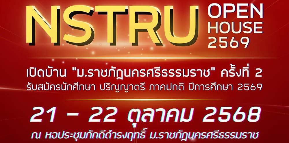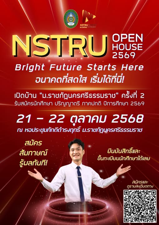 NSTRU open house 2569 “Bright Future Starts Here อนาคตที่สดใส เริ่มได้ที่นี่!” เปิดบ้าน มหาวิทยาลัยราชภัฏนครศรีธรรมราช ครั้งที่ 2 รับสมัครนักศึกษา ปริญญาตรี ภาคปกติ ปีการศึกษา 2569 วันที่ 21 -22 ตุลาคม 2568 ณ หอประชุมภักดีดำรงฤทธิ์ มหาวิทยาลัยราชภัฏนครศรีธรรมราช